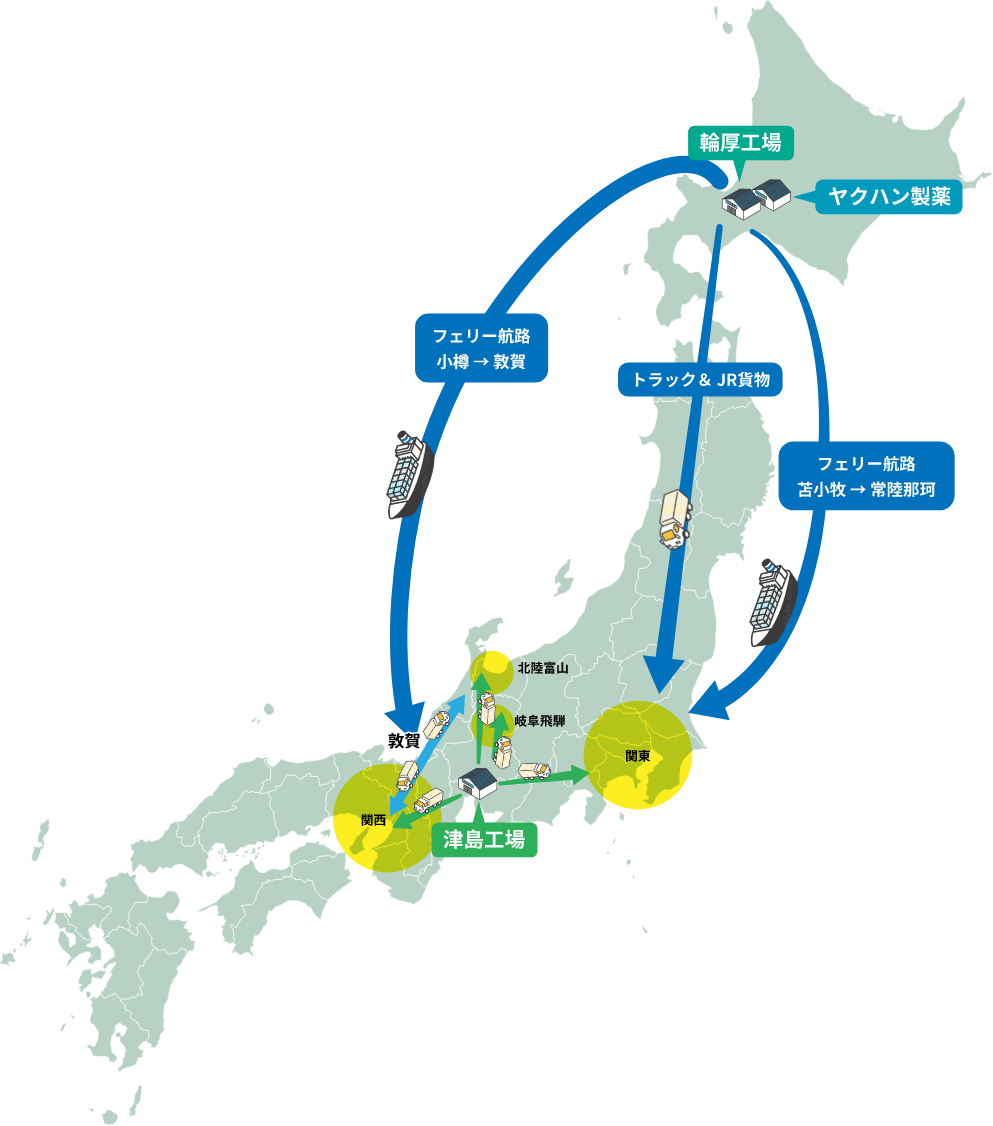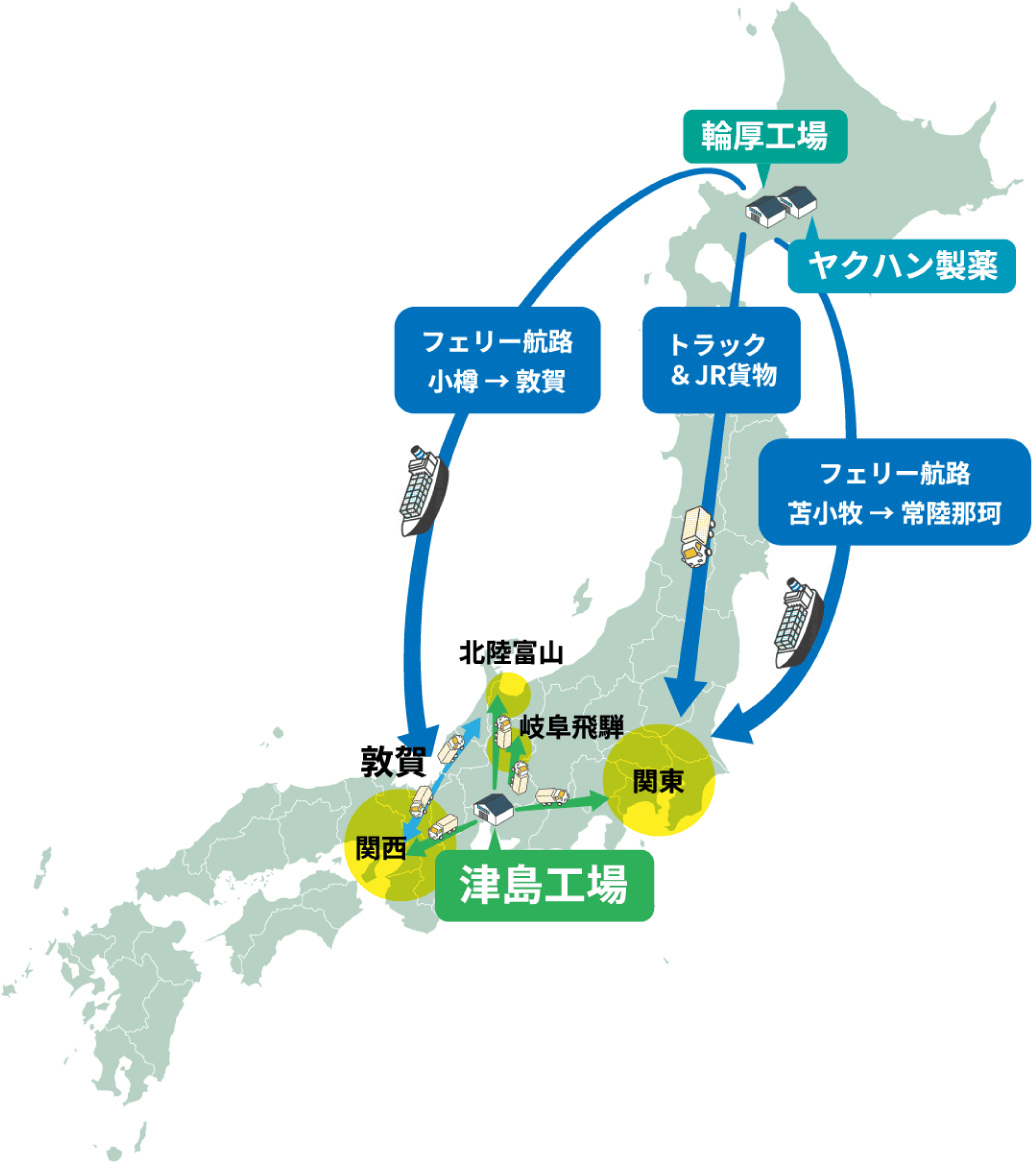 愛知県津島市と北海道北広島市において、津島工場と輪厚工場を稼働しています。そして2023年には、北海道北広島市のヤクハン製薬を子会社化。3拠点でバックアップ体制を整え、液剤製造を手がけています。いずれの工場でも充実した生産体制を備え、さまざまなニーズに安定供給を通じて応えるとともに、BCP対策にも努めています。
